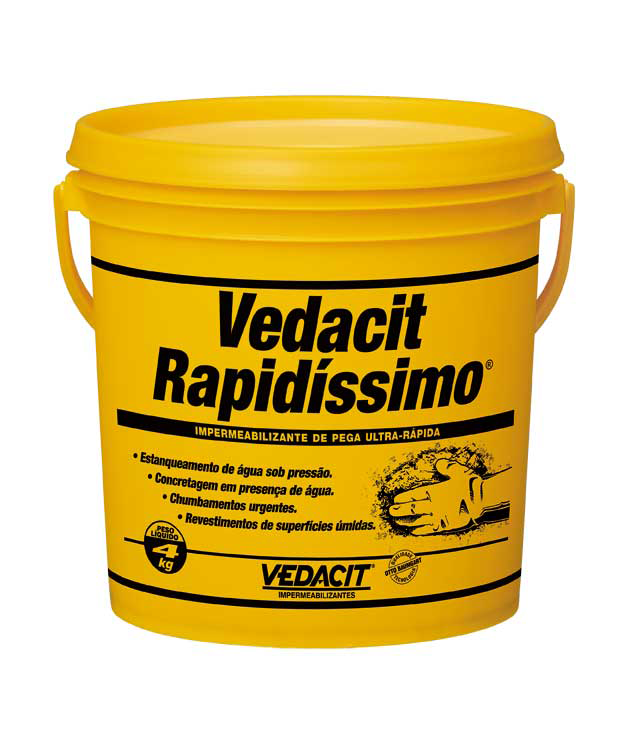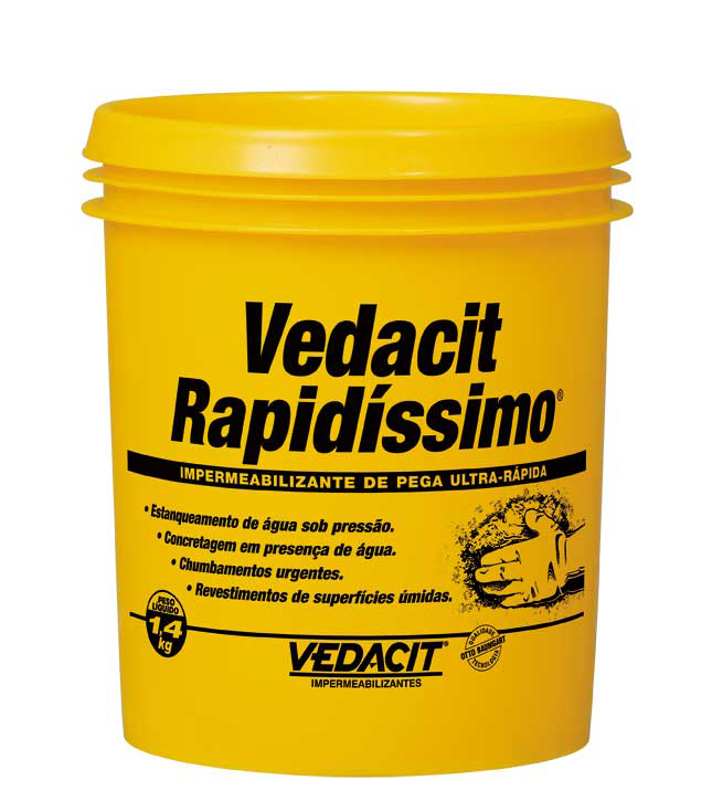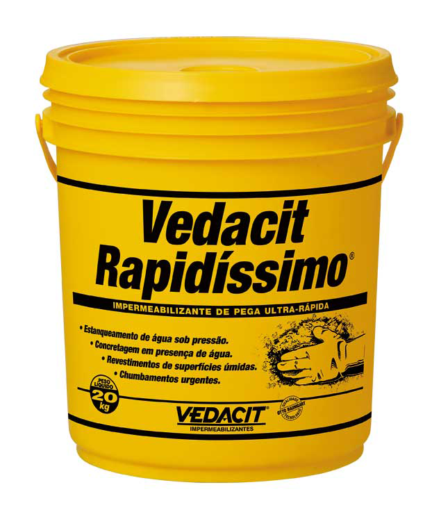 VEDACIT RAPIDÍSSIMO acelera de forma ultrarrápida a pega do cimento, permitindo o tamponamento instantâneo de vazamentos e infiltrações e acelera a resistência de argamassas para rápida liberação.