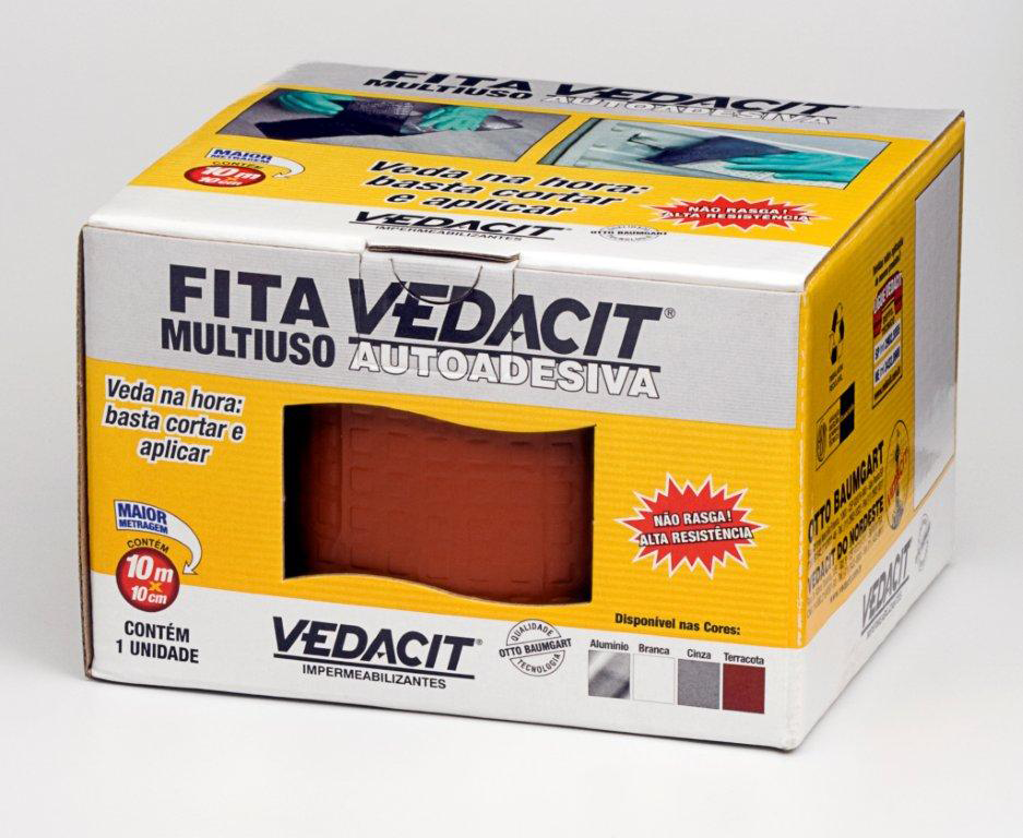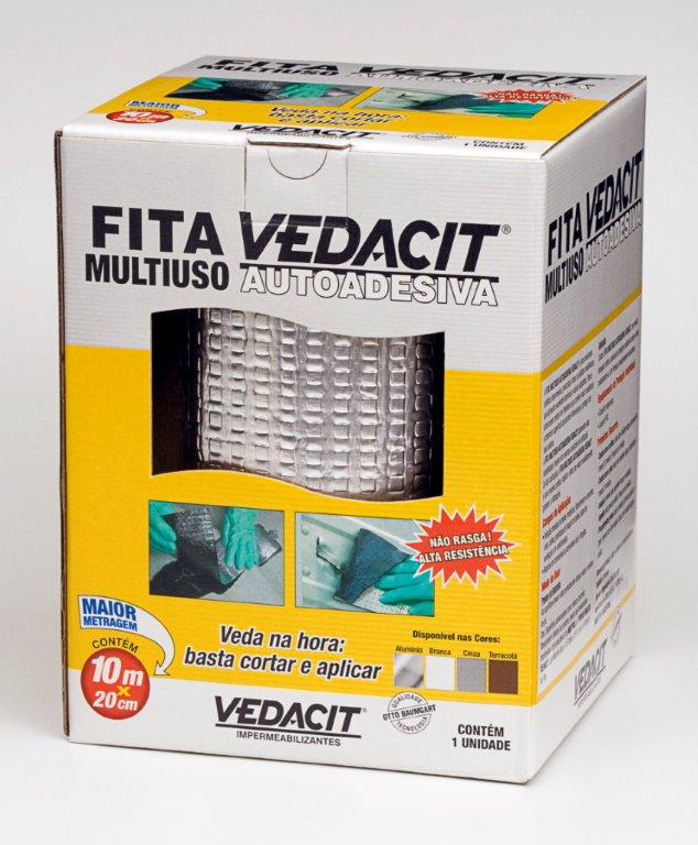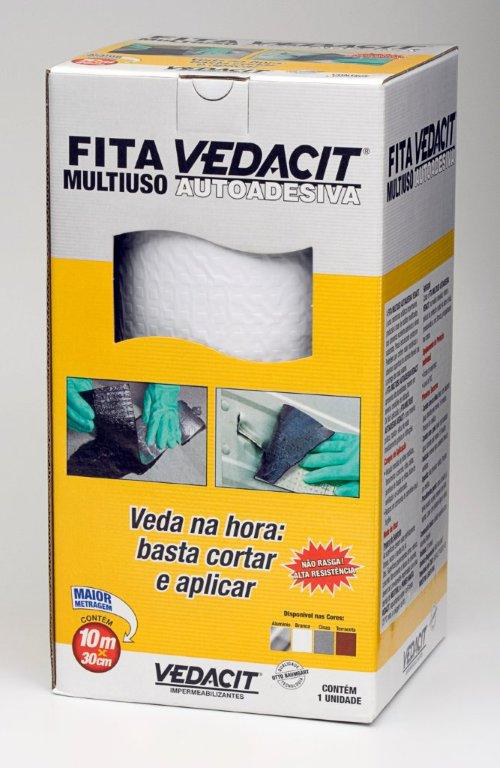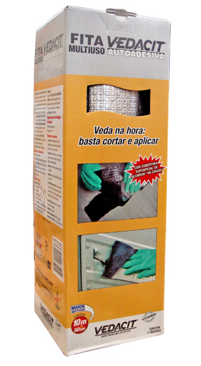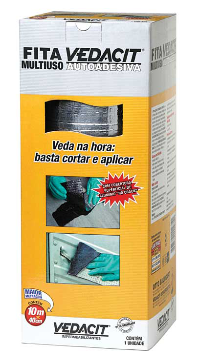 A FITA MULTIUSO AUTOADESIVA VEDACIT é uma membrana asfáltica impermeável, produzida à base de asfaltos modificados, que apresenta excelente aderência a vários substratos. Possui estruturante central em Polietileno que confere maior resistência e flexibilidade. A cobertura superficial de alumínio NO CRACK atua como uma barreira refletora dos raios solares e apresenta alta durabilidade, mesmo em severas condições de utilização. De fácil aplicação, é uma maneira prática, rápida e eficaz de vedar imediatamente goteiras e infiltrações..