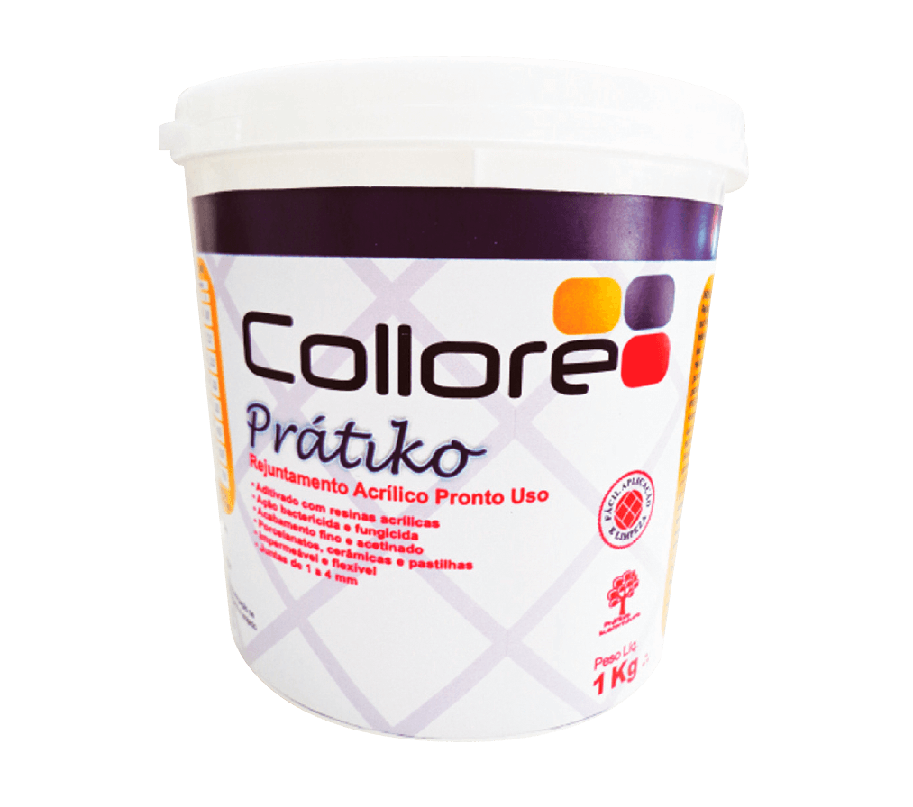 O Rejuntamento Collore Pratiko Pronto Uso é formulado à base de Resina Acrílica, Carga Mineral, Aditivos Especiais, Pigmentos Inorgânicos e Biocidas.