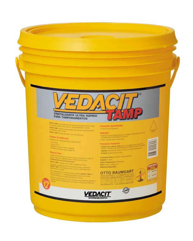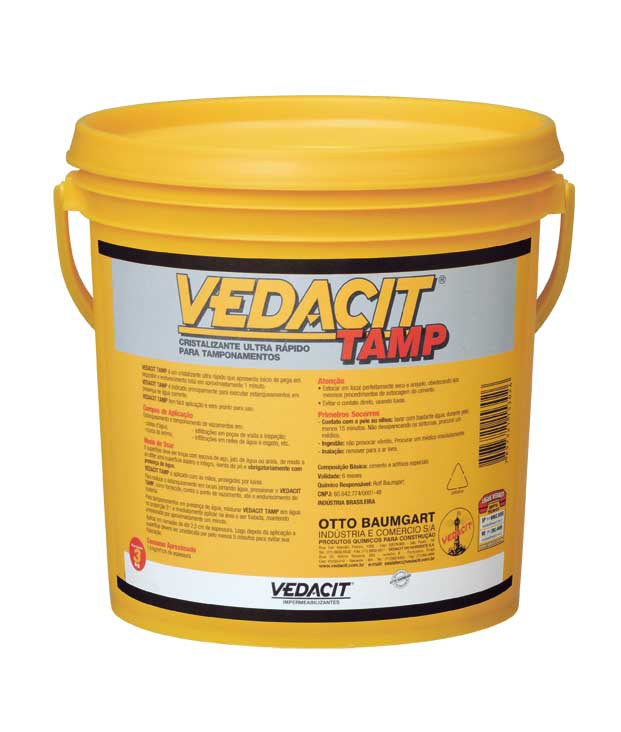 VEDACIT TAMP é um cristalizante ultrarrápido que apresenta início de pega em segundos e endurecimento total em aproximadamente 1 minuto. É indicado principalmente para executar estanqueamentos em presença de água corrente. VEDACIT TAMP tem fácil aplicação e vem pronto para uso.