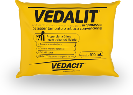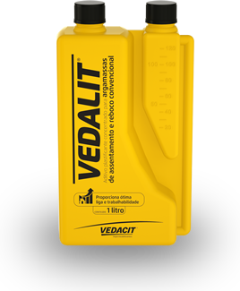 VEDALIT é um aditivo concentrado que proporciona ótima trabalhabilidade a argamassas e rebocos. Por ser líquido, facilita o trabalho, proporcionando economia de material e excelente acabamento do serviço. Agrega uma série de vantagens às argamassas: maior aderência, coesão, ausência de fissuras e menor exsudação. Argamassas preparadas com VEDALIT não precisam ser curtidas.
